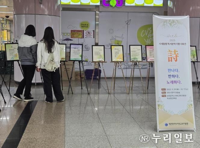 (누리일보) 대전서부교육지원청은 9월 29일부터 10월 17일까지 대전시청역 대합실(대전 서구 둔산중로 55)에서 2025학년도 사제동행 독서문학기행 참가자 28명의 시화 작품 전시회 '詩-만나다. 반하다. 노래하다.'