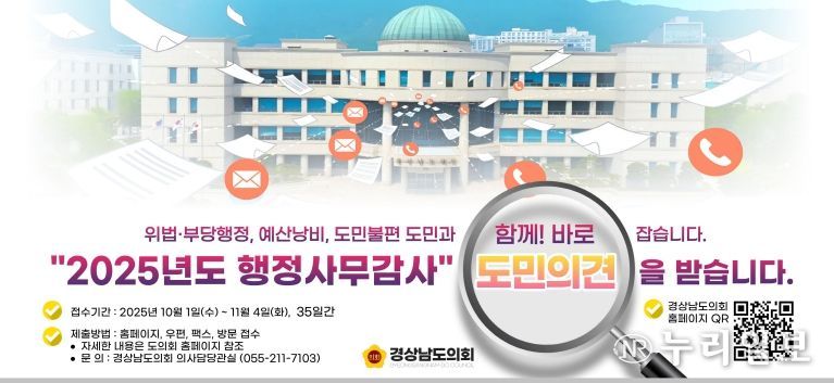 (누리일보) 경상남도의회는 11월 5일부터 18일, 14일간 예정되어 있는 ‘2025년도 행정사무감사’를 앞두고 도민의 의견을 받는다고 밝혔다.