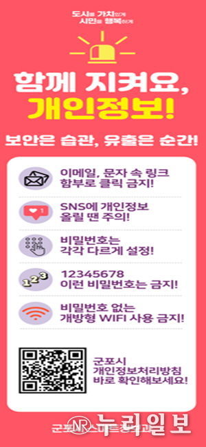 (누리일보) 군포시는 9월 30일 ‘개인정보 보호의 날’을 맞아 시민들의 개인정보 보호 인식을 높이고 생활 속 보호 문화를 확산하기 위해 ‘2025년 개인정보 보호의 날 기념 캠페인’을 9월 24일부터 10월 2일까지 추진한다.