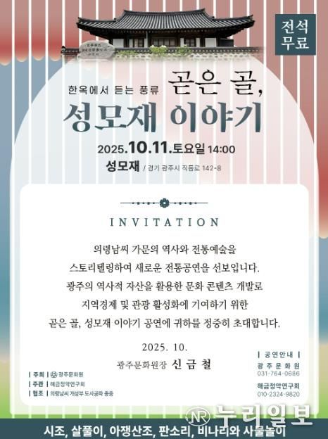 (누리일보) 광주문화원은 성모재(직동로142-8)에서 2025년 10월 11일 14:00 시민들을 대상으로 “제10회 광주시 문화의 날 행사” 를 개최한다고 밝혔다.