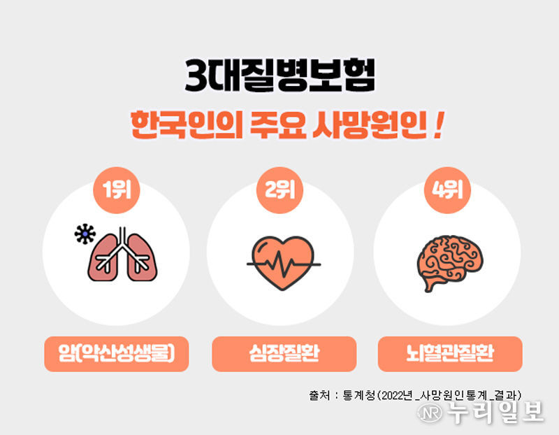 (누리일보) 3대질병으로 일컬어지는 암, 뇌혈관질환, 심혈관질환은 한국인의 주요 사망원인에서 상위를 차지하고 있으며, 이에 대한 진단비를 집중적으로 보장해 주는 보험상품을 3대질병진단비 보험이라 할 수 있다.