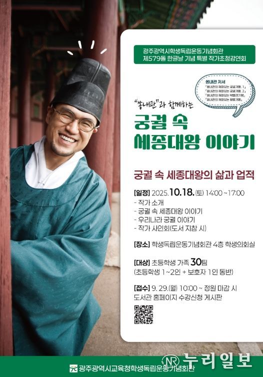 송 작가는 조선시대 궁궐 문화를 통해 세종대왕의 철학과 애민정신, 한글창제 역사 등을 흥미롭게 전달한다. 강연 후에는 도서 사인회, 사진 촬영 등 작가와의 만남 시간도 마련된다.