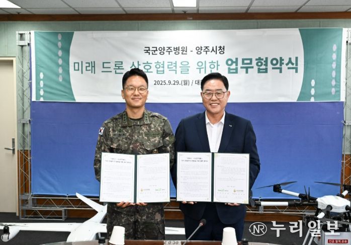 (누리일보) 양주시가 지난 29일 국군양주병원과 손잡고 ‘드론산업 발전 및 활용을 위한 업무협약’을 체결했다.