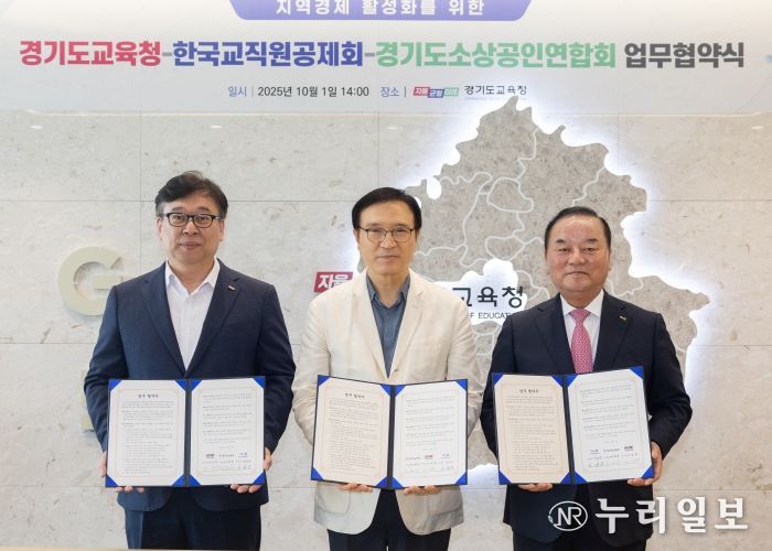 (누리일보) 경기도교육청이 1일 남부청사에서 경기도소상공인연합회, 한국교직원공제회와 ‘지역경제 활성화를 위한 상생 업무협약’을 체결했다.