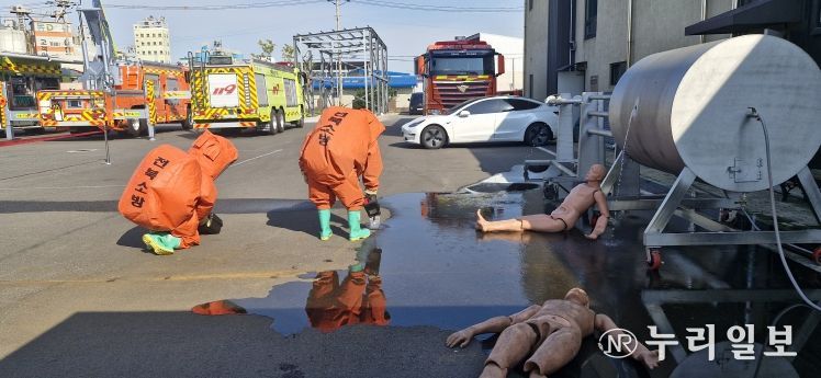 (누리일보) 전북특별자치도소방본부는 지난 1일 119특수대응단 화학구조대 청사에서 유해화학물질 누출 사고 대응 역량 강화를 위한 합동훈련을 실시했다.