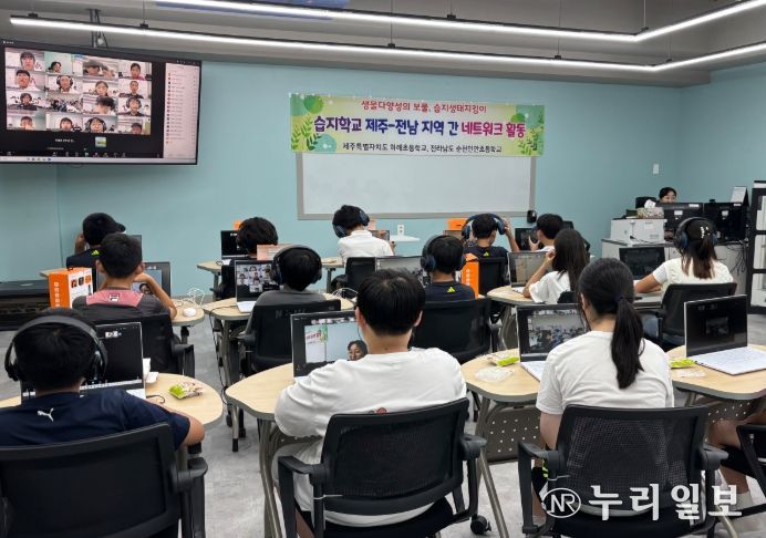 (누리일보) 제주도교육청 하례초등학교는 9월 30일 전남 순천인안초등학교와 함께 비대면 화상회의 플랫폼(ZOOM)을 활용해 생태관광을 주제로 공동수업을 진행했다.