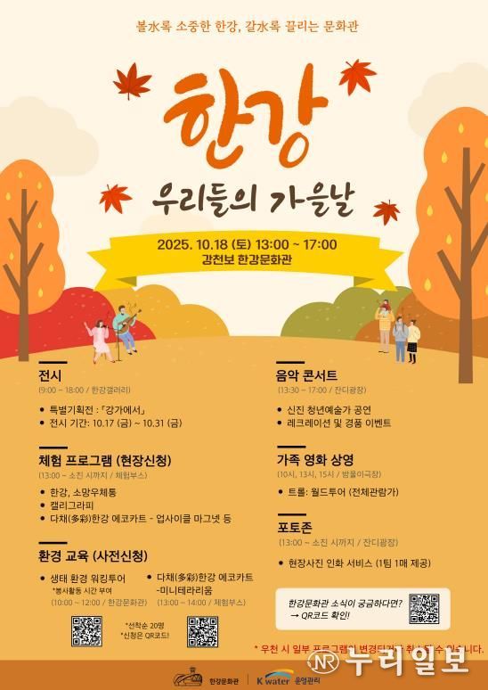 (누리일보) K-water한강보관리단과 케이워터운영관리 한강문화관은 오는 10월 18일 가족과 이웃이 함께 즐기는 대표 문화축제 “한강, 우리들의 가을날”를 개최한다고 밝혔다
