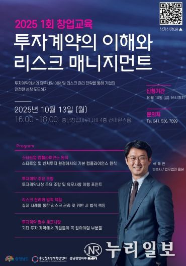 교육은 2025년 10월 13일 충남창업마루나비에서 진행되며, 류재언 변호사(법무법인 율본)가 강사로 참여해 스타트업 컴플라이언스 원칙, 투자계약 주요 조항, 리스크 관리 및 법적 책임, 투자계약 필수 체크사항 등을 상세히 강의할 예정이다.