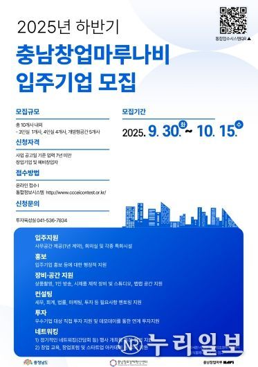 (누리일보) (재)충남창조경제혁신센터는 오는 10월 15일까지 2025년 하반기 충남창업마루나비 입주기업을 모집한다고 밝혔다. 이번 모집은 혁신적인 아이디어와 성장 잠재력을 지닌 스타트업을 발굴해 안정적인 보육 환경을 제공하고, 기업의 지속적인 성장을 지원하기 위해 추진된다.