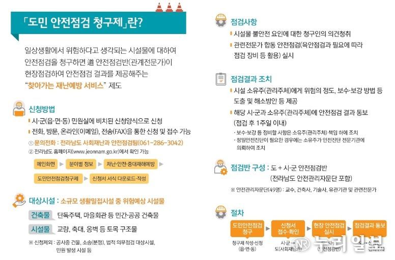 (누리일보) 전라남도는 각종 재난으로부터 도민의 생명과 재산을 보호하고 일상 생활주변에 불안전한 위험요소를 찾아 무료로 안전점검하는 ‘도민 안전점검 청구제’를 운영하고 있다고 밝혔다.