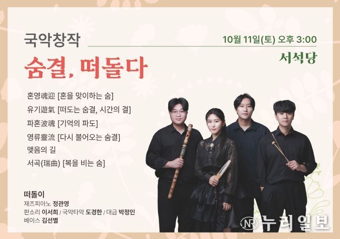 (누리일보) 광주문화재단(대표이사 노희용) 전통문화관은 오는 10월 11일 오후 3시, 토요 상설공연 22회차로 퓨전국악 단체 떠돌이의 '숨결, 떠돌다' 무대를 선보인다.