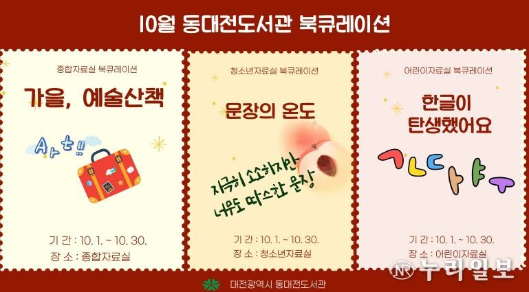 (누리일보) 동대전도서관은 가을 독서의 계절을 맞아 10월 한 달간 연령별 맞춤 주제 북큐레이션 전시를 운영한다고 10일 밝혔다.