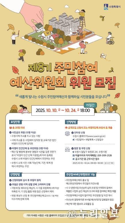 (누리일보) 수원특례시는 10월 24일까지 제8기 주민참여예산위원회 위원을 공개 모집한다.