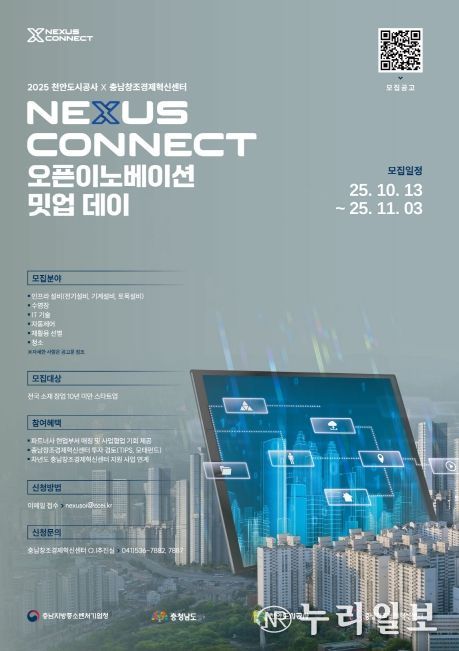 (누리일보) (재)충남창조경제혁신센터와 천안도시공사(지방공기업)은 스마트 시티 (공공 인프라·시설운영)분야 스타트업을 발굴·육성하기 위해 ‘2025 천안도시공사 x 충남창조경제혁신센터 Nexus Conncect 오픈이노베이션 밋업 데이’참여 기업을 11월 3일까지 모집한다고 밝혔다.