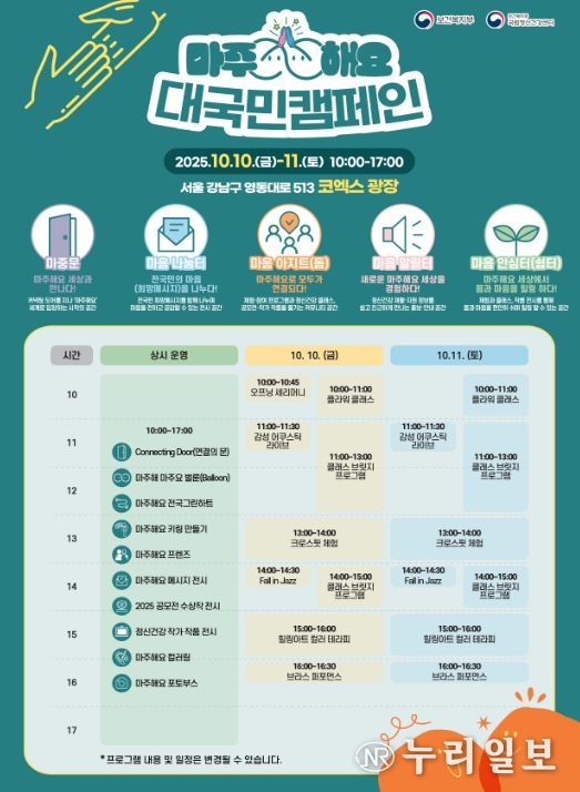 (누리일보) 보건복지부와 국립정신건강센터는 ‘정신건강의 날’을 맞아 10월 10일에서 11일까지 양일간 서울 코엑스 야외광장에서 '마주해요! 대국민 캠페인'을 개최한다.