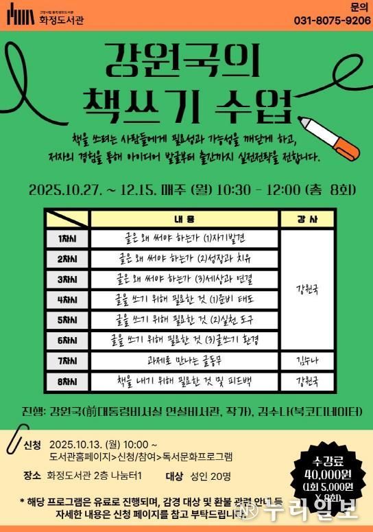 (누리일보) 고양특례시는 10월 27일부터 12월 15일까지 매주 월요일 오전 10시 30분부터 12시까지, 화정도서관 2층 나눔터1에서 ‘강원국의 책쓰기 수업’프로그램을 운영한다고 밝혔다.
