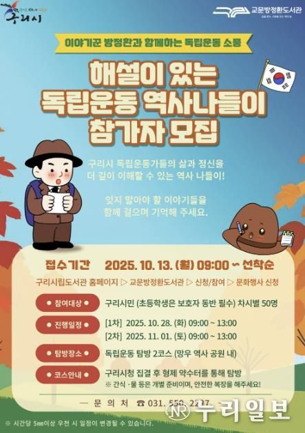 (누리일보) 구리시는 오는 10월 13일부터 27일까지 교문 방정환 도서관에서 진행하는 ‘해설이 있는 독립운동 역사 나들이’ 프로그램의 참여자를 모집한다고 밝혔다.