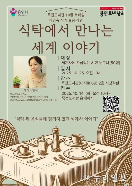 (누리일보) 용인특례시는 25일 오전 10시 죽전도서관 시청각실에서 죽전도서관 북타임 작가초청강연회 ‘식탁에서 만나는 세계 이야기’를 연다고 13일 밝혔다.