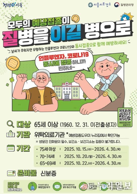 (누리일보) 시흥시는 오는 10월 15일부터 내년 4월 30일까지 65세 이상(1960년 12월 31일 이전 출생자) 어르신을 대상으로 독감(인플루엔자)과 코로나19 예방접종을 동시에 진행한다.