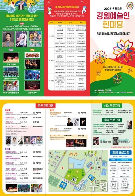 (누리일보) 강원예술인과 도민의 화합·소통·공감을 위한 '2025 제3회 강원예술인 한마당' 행사가 오는 10월 17일부터 19일까지 3일간 횡성문화체육공원 일원에서 열린다.