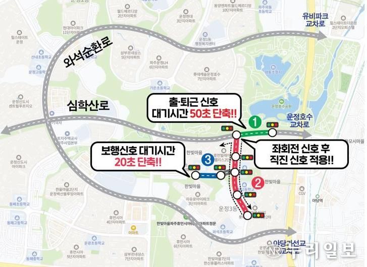 (누리일보) 파주시는 출퇴근 시간대에 신호주기가 길어 불편했던 운정 한빛마을 5단지 및 2·5단지 소도로 일대 구간의 신호체계를 우선적으로 개선했다고 밝혔다.