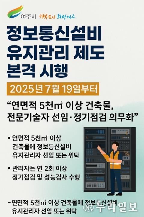 (누리일보) 여주시는 지난 7월 19일부터 ‘정보통신설비 유지보수 ‧ 관리제도’를 본격 시행하고있다고 밝혔다. 이번 제도는 일정 규모 이상의 건축물에서 통신설비가 노후되거나 방치돼 시민 불편이 발생하는 사례를 예방하기 위해 마련된 것으로, 통신설비의 체계적 관리와 안전 강화를 목표로 하고 있다.