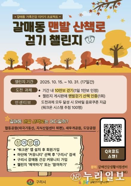 (누리일보) 구리시는 가을철 주민들의 건강한 생활 습관 형성과 스트레스 완화를 위해 ‘갈매동 맨발 산책로 걷기 챌린지’를 오는 10월 15일부터 31일까지 17일간 운영한다고 밝혔다.