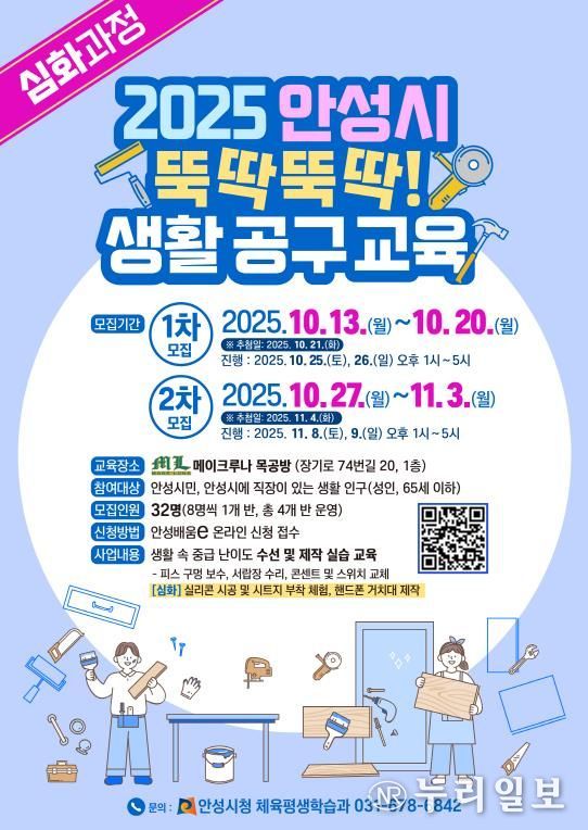 (누리일보) 안성시는 시민들의 생활 자립 역량 강화를 위해 '뚝딱뚝딱 생활 공구[심화과정] 교육'을 오는 10월 25~26일과 11월 8~9일, 총 2회 주말 일정으로 운영한다고 밝혔다.