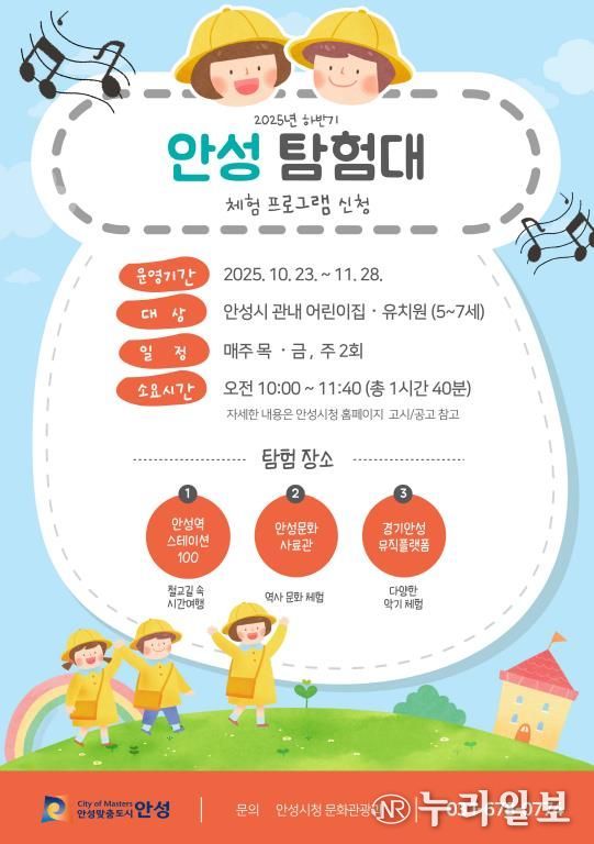 (누리일보) 안성시는 상반기에 시범 운영해 큰 호응을 얻은 유아 대상 체험형 프로그램 ‘안성 탐험대: 역사 속으로, 음악 속으로!’를 하반기에도 운영하며, 지역 문화시설 활성화에 나선다.