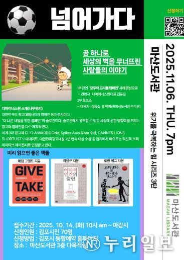 (누리일보) 마산도서관은 오는 11월 6일 19시, 본관 3층 다목적실에서 ‘공 하나로 세상의 벽을 무너뜨린 사람들의 이야기’ 프로그램을 운영한다고 밝혔다.
