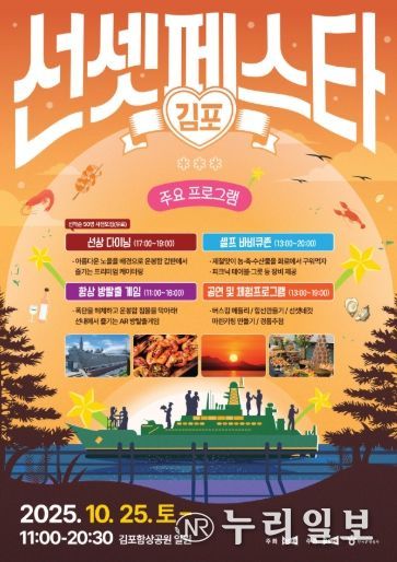 (누리일보) 아름다운 석양을 배경으로 선상 다이닝을 즐길 수 있는 특별한 축제가 김포에서 열린다. 오는 25일 단 하루, 토요일 오전 11시부터 밤 8시 30분까지 대곶면 김포함상공원 일원에서 ‘2025 김포 선셋 페스타 위드(with) 로컬푸드 다이닝’이 개최된다.