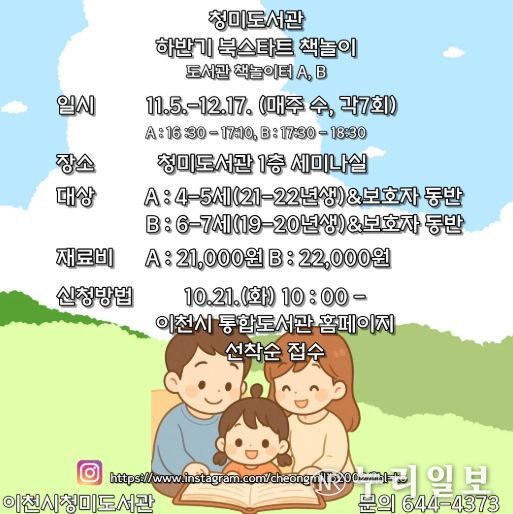 (누리일보) 이천시 청미도서관은 오는 11월 5일부터 12월 17일까지, 유아와 보호자를 대상으로 ‘하반기 북스타트 책놀이’ 프로그램을 운영한다.