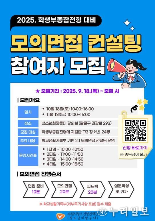 (누리일보) 수원시청소년청년재단 청소년희망등대는 2026학년도 대학입시를 준비하는 청소년들을 대상으로 ‘학생부종합전형 모의면접 컨설팅’ 프로그램을 운영하며, 9월 18일부터 참가자를 모집중이다.