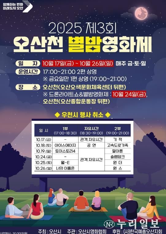 (누리일보) 오산시는 오는 10월 17일부터 26일까지 매주 금·토·일 저녁, 오산천(오색문화체육센터 뒤편)에서 시민들이 야외에서 영화를 즐길 수 있는 '2025 제3회 오산천 별밤영화제'를 개최한다고 밝혔다.