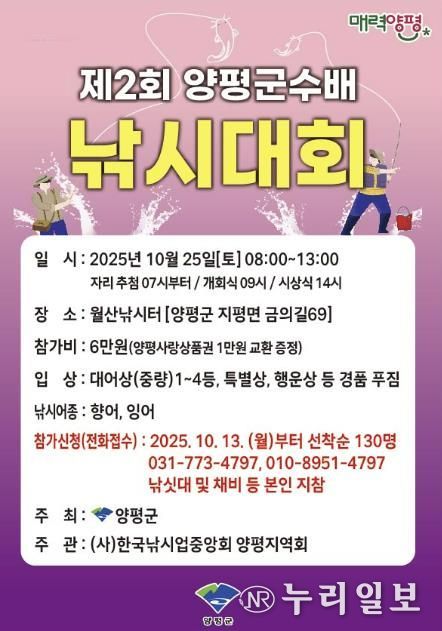 (누리일보) 양평군은 오는 25일 관내 월산낚시터에서 ‘제2회 양평군수배 낚시 대회’를 개최한다고 밝혔다.