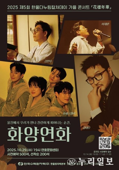 (누리일보) 한국수력원자력(주) 한울원자력본부는 오는 10월 29일 19시 울진군 연호문화센터에서 ‘화양연화(花樣年華): 찬란하게 빛났던 그 순간’을 주제로, 긴 세월에도 잊히지 않는 청춘의 명곡들을 되새기며 깊어져 가는 늦가을의 정취를 나누고자 제5회 한울다누림컬쳐데이 가을 콘서트를 개최한다.