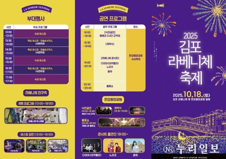 (누리일보) 대한민국의 베니스 ‘라베니체’를 100% 즐길 수 있는 ‘2025 김포 라베니체 축제’가 오는 18일 한강중앙공원과 라베니체 일원에서 열린다. K-드라마 성지이자 대한민국 대표 야간명소로 이름난 라베니체에서 수상버스킹과 불꽃쇼를 동시에 즐길 수 있는 1년에 단 하루 열리는 축제다.