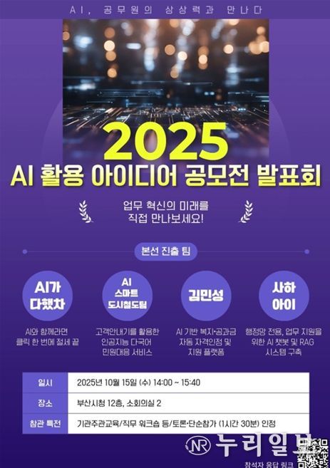 (누리일보) 부산시는 오늘(15일) 오후 2시, 시청 12층 소회의실2에서 '2025년 에이아이(AI) 활용 아이디어 공모전 발표회'를 개최한다고 밝혔다.