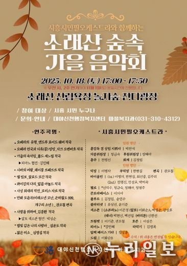 (누리일보) 시흥시 대야ㆍ신천행정복지센터는 오는 10월 18일 소래산 삼림욕장 놀자숲 잔디광장에서 대야ㆍ신천동 지역 주민을 위한 ‘소래산 숲속 가을 음악회’를 개최한다.