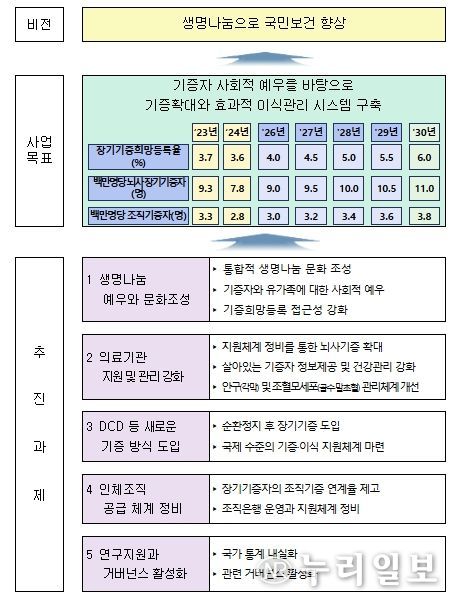구체적으로 ‘생명나눔으로 국민보건 향상’이라는 비전하에, ①생명나눔 예우와 문화조성, ②의료기관 지원 및 관리 강화, ③순환정지 후 장기기증 등 새로운 기증방식 도입, ④인체조직 공급체계 정비, ⑤연구지원과 거버넌스 활성화 등 5개 대과제, 12개 세부과제를 추진한다.