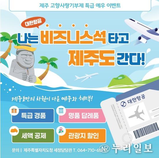 제주도는 10월 16일부터 11월 16일까지 한 달간 제주 고향사랑기부제 활성화를 위한 ‘나는 비즈니스석 타고 제주도 간다!’ 행사를 진행한다고 밝혔다.