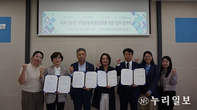 (누리일보) 제주연구원(원장 유영봉) 제주사회복지연구센터(센터장 오윤정)는 2025년 10월 17일, 지속가능한 지역공동체 활성화를 위해 제주특별자치도 지속가능발전협의회, 일배움터, 제주특별자치도 마을만들기종합지원센터와 업무협약을 체결했다.