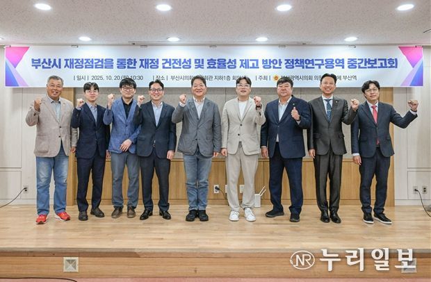 (누리일보) 부산광역시의회 의원연구단체 (대표 성창용의원)‘부산시민이 행복할 수 있도록 역할을 하는 모임’(약칭 부산역)에서는 10월 20일 시의회 의원회관 회의실에서 정책연구용역『부산시 재정 점검을 통한 재정 건전성 및 효율성 제고 방안』 중간보고회를 개최했다.