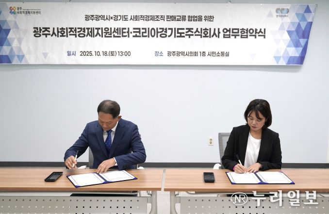 (누리일보) 경기도주식회사와 광주광역시 사회적경제지원센터가 지난 18일 광주광역시 시의회에서 ‘경기도-광주광역시 사회적경제조직 판매교류 협업을 위한 업무협약’을 체결하고 사회적경제조직 활성화를 위해 공동 노력하기로 했다.