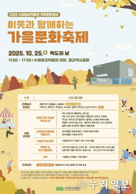 (누리일보) 수원광교박물관은 독도의 날인 10월 25일 오전 11시부터 오후 5시까지 수원광교박물관 야외(광교역사공원)에서 ‘2025 수원광교박물관 가족문화행사–이웃과 함께하는 가을문화축제’를 연다.
