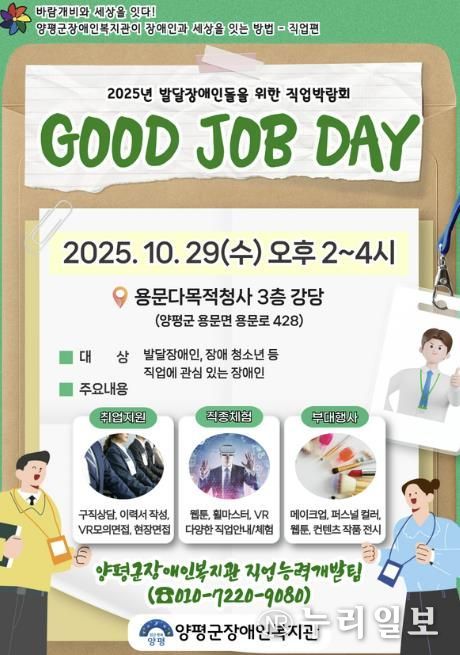 (누리일보) 대한불교조계종사회복지재단이 운영하는 양평군장애인복지관은 오는 29일 오후 2시부터 4시까지 용문다목적청사 3층 강당에서 발달장애인의 직업 탐색 기회를 지원하기 위한 직업박람회 ‘GOOD JOB DAY’를 개최한다.