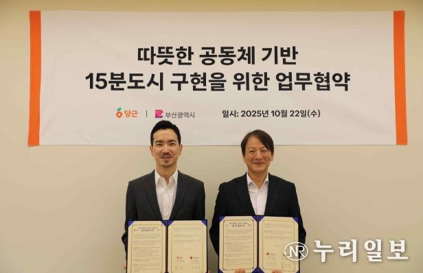 (누리일보) 부산시는 22일 오후 2시 10분 서울 ㈜당근마켓 본사에서 ㈜당근마켓(대표이사 황도연)과 '따뜻한 공동체 기반 15분도시 구현을 위한 업무협약'을 체결했다고 밝혔다.