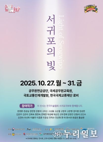 ‘예술이다 서귀포, 혁신이 주는 달콤함’의 피날레를 함께하는 한국미술협회 서귀포지부와 함께하는 특별기획전시 '로비가 미술관: 서귀포의 빛'이 27일(월)부터 31일(금)까지 추진된다. 전시는 공무원연금공단, 국세공무원교육원, 국토교통인재개발원, 한국국제교류재단 로비에서 동시에 펼쳐지며, ‘서귀포의 빛’이라는 주제로 아름답게 빛나는 서귀포의 모습과 색감을 작가들의 다양한 감성으로 표현된 작품을 선보인다. 매일 스쳐지나가는 로비의 풍경에서 영감이 가득한 일터로의 변화를 느낄 수 있도록 기획했다.