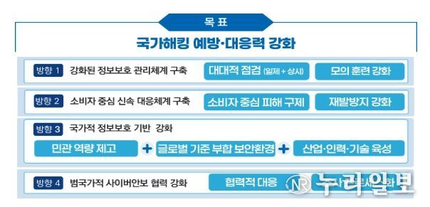 (누리일보) 과학기술정보통신부와 관계부처는 전방위적인 해킹 사고로 국민 불안이 가속화되는 현 상황을 신속히 극복하고 국가 전반의 정보보호 역량을 강화하기 위해 '범부처 정보보호 종합대책'을 수립하여 10월 22일 대국민 브리핑을 통해 발표했다.