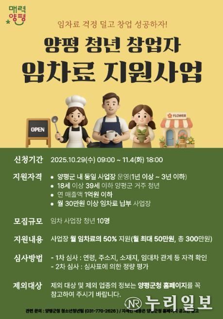 (누리일보) 양평군은 지속되는 경기 침체와 고물가 등 어려운 창업 환경 속에서 청년 창업자의 임차료 부담을 완화하기 위해 ‘2025년 양평 청년 창업자 임차료 지원 사업’을 올해 처음으로 시행한다고 밝혔다.